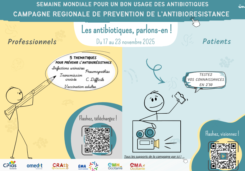 En collaboration avec les EMH et EMA de la région Occitanie et à partir des résultats des quiz de leurs campagnes précédentes (2022-23-24), le CRAtb, L’OMEDIT et le CPIas Occitanie ont élaboré des supports pour un meilleur usage des antibiotiques 2025 à destination des médecins, pharmaciens et paramédicaux.