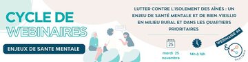 Nous vous donnons rendez-vous en ligne, le mardi 25 novembre 2025 de 14h à 16h, pour le dernier webinaire du cycle, intitulé "Lutter contre l’isolement des aînés : un enjeu de santé mentale et de bien-vieillir en milieu rural et dans les quartiers prioritaires".